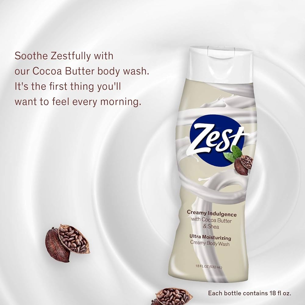 Creamy indulgence with cocoa butter & shea. Bonus size 9% more vs. 16.5 fl. oz. U.S. Wrap yourself in the luscious scent and rich lather to moisturize and nourish your skin. Enriched with softening shea butter and creamy cocoa butter extracts, this creamy body wash is formulated to make your skin feel silky smooth and deeply moisturized for a healthy-looking glow. zest.com. Made in USA with domestic and imported ingredients.