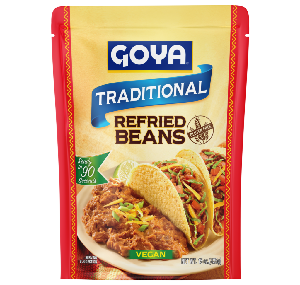 Goya Traditional Refried Pinto Beans in a 15 oz pouch are authentic, creamy, and chunky-smooth beans ready in 90 seconds. Seasoned with onion, garlic, and spices, these vegan, gluten-free, and cholesterol-free beans are ideal for burritos, dips, and sides.