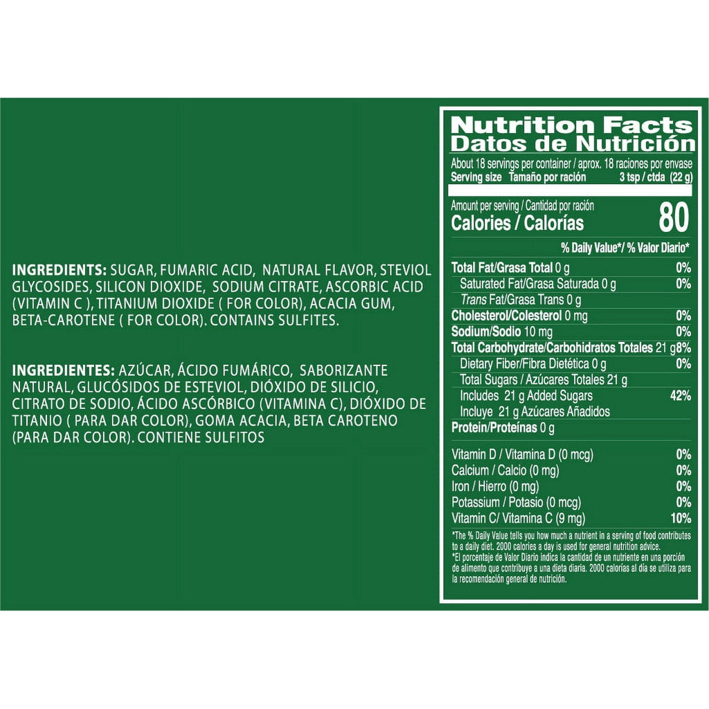 Sugar, Citric Acid, Maltodextrin, Natural Flavors, Sucralose, Stevia Leaf Extract, Sodium Citrate, Silicon Dioxide, Titanium Dioxide, Yellow 5. (Tartrazine).