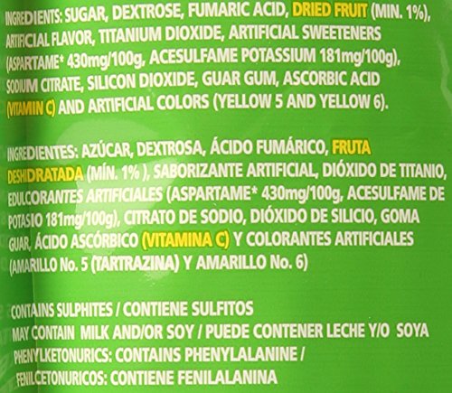 Dextrose, Sugar, Fumaric Acid, Artificial Flavor, Sodium Citrate, Titanium Dioxide, Silicon Dioxide, Aspartame, Guar Gum, Acesulfame Potassium, Artificial Colors (Fd&C Yellow 5, Fd&C Yellow 5 Lake, Fd&C Yellow 6 And Fd&C Yellow 6 Lake), Ascorbic Acid (Vitamin C) And Dried Orange Juice