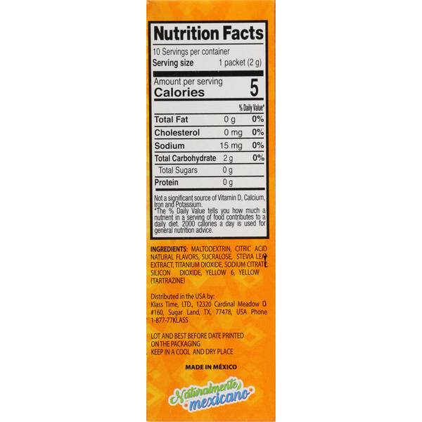 Add some variety to your everyday activities with this pineapple-tangerine pack containing 10 Servings Of Klass Aguas Frescas Stick Packs. Our Pineapple-Tangerine Drink Mix Is Filled With 10 Stick Packets. Shake It Up Anywhere With Our Fun And Fresh Traditional Mexican Flavors. Klass Aguas Frescas Stick Pack Are Sugar-Free. No Artificial Colors. Flavored From Natural Sources.