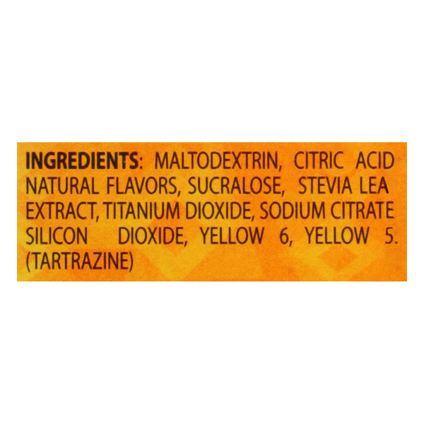 Maltodextrin, Citric Acid, Natural Flavors, Sucralose, Stevia Leaf Extract, Titanium Dioxide, Sodium Citrate, Silicon Dioxide, Yellow 6, Yellow 5, (Tartrazine).