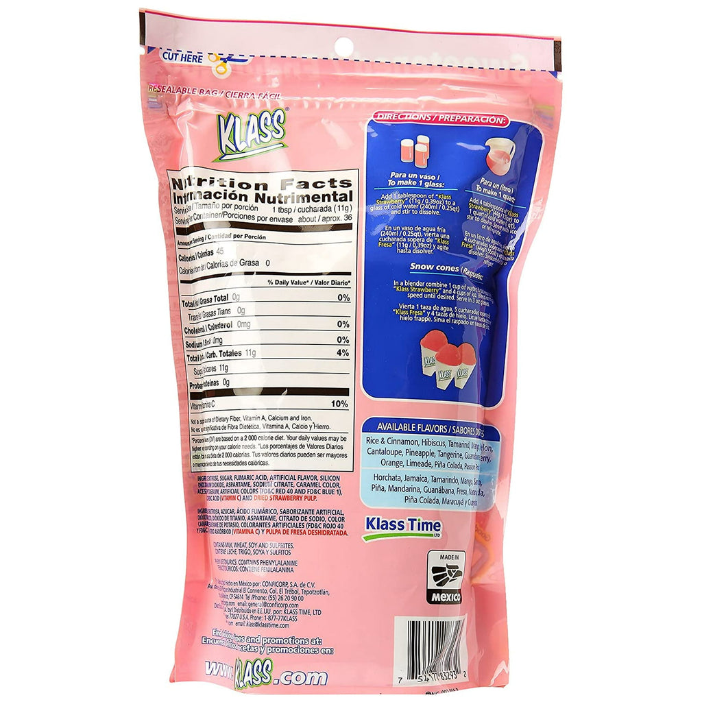 Klass Strawberry flavored drink mix is an excellent & nutritious beverage for you. Just follow the directions indicated on the back of the package, add water & the drink mix (no sugar is required) and its ready to be served ice cold. Klass comes in a resealable bag for fresh & easier storage.