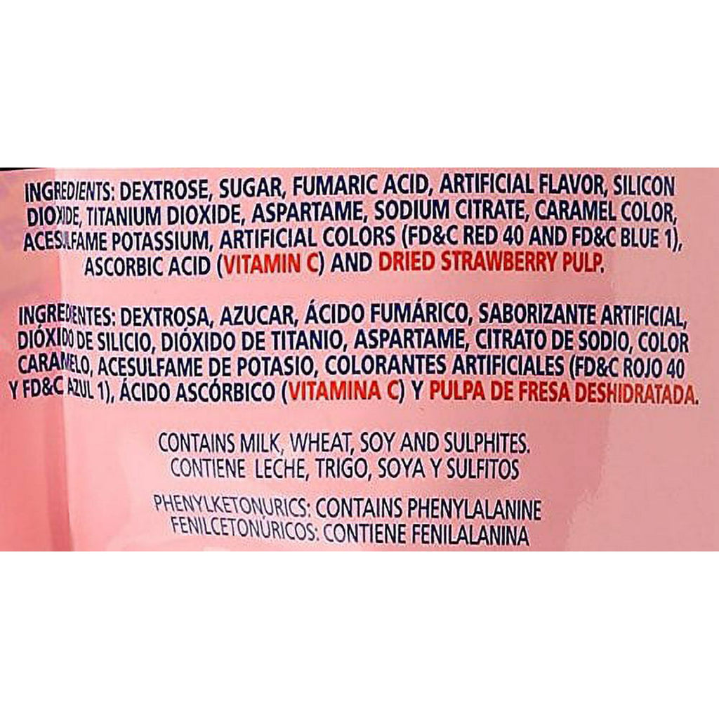 sugar, fumaric acid, artificial flavor, silicon dioxide, sodium citrate, titanium dioxide, apple fiber, caramel color, dried strawberry pulp, artificial colors (FD&C red 40, FD&C red 40 lake and FD&C blue 1), ascorbic acid (vitamin c) and sucralose.
