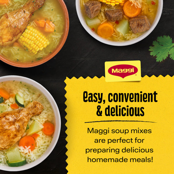 MAGGI BEEF FLAVORED RICE SOUP MIX is a quick, authentic Latin-style broth with instant noodles, offering a rich, savory taste in under 10 minutes. The 2.11 oz (or 1.94 oz) packets are low-fat, cholesterol-free, and contain 50 calories per serving. Key ingredients include wheat flour, salt, cornstarch, and beef extract.