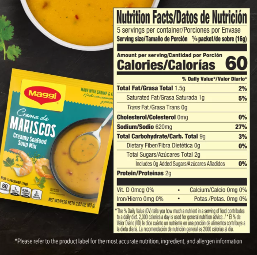 Maggi mariscos creamy seafood soup mix is a quick-prep, authentic Latin-style dehydrated mix featuring a rich, creamy texture and seafood flavor. Ready in under 10 minutes, this 80-calorie serving option requires only water and milk. It serves as a convenient meal base for lunch or dinner.